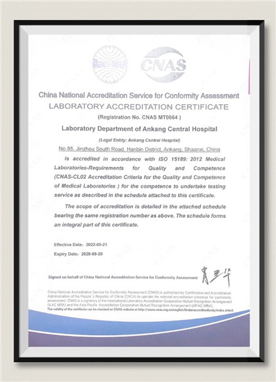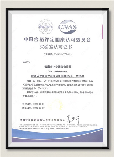 暑退九霄凈,秋澄萬景清。在國慶節(jié)來臨之際,安康市中心醫(yī)院檢驗科正式收到中國合格評定國家認可委員會(CNAS)頒發(fā)的ISO15189醫(yī)學實驗室認可證書,成為ISO15189質(zhì)量與能力認可醫(yī)學實驗室。這標志著檢驗科質(zhì)量管理水平與技術(shù)能力已達到國際標準化水平,向國際先進實驗室行列邁進,檢驗結(jié)果更加精準可靠,臨床服務(wù)能力實現(xiàn)再躍升。