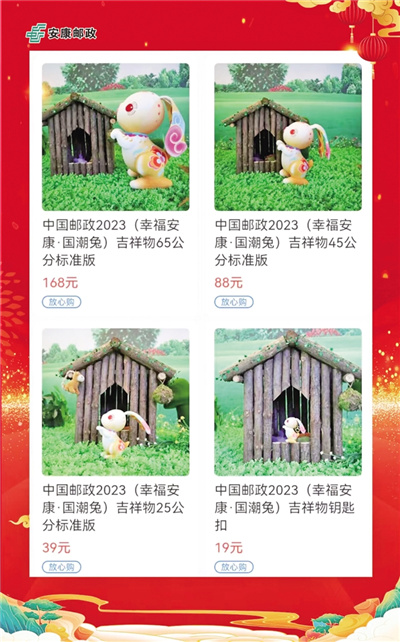目前該產品有四款規格:12厘米的鑰匙扣(包掛或車掛);25厘米手辦禮物玩偶;45厘米中型玩偶;65厘米收藏級玩偶。為滿足更多的群眾需求,安康郵政打通內外部平臺,搭建線上線下銷售渠道,線下在郵政各網點、合作單位宣傳展示;線上通過京東商城、Ai郵安康抖音等全面推廣。結合即將來臨的春節氛圍營造,安康郵政各營業網點特別布置了“玉兔呈祥·幸福安康”打卡專區,供喜愛國潮毛絨玩具的廣大群眾打卡留念,為癸卯年新春的到來新增了更多喜慶祥和的氛圍。