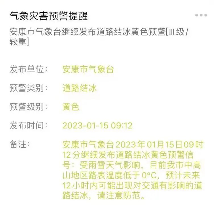 今天09時12分,安康市氣象臺繼續發布道路結冰黃色預警信號:受雨雪天氣影響,目前安康市中高山地區路表溫度低于0℃,預計未來12小時內可能出現對交通有影響的道路結冰,請注意防范。