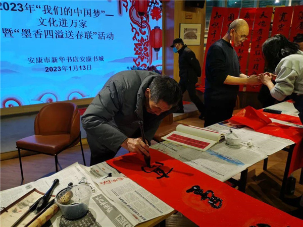 歡天喜地度佳節(jié),張燈結彩迎新春。春節(jié)將至,為積極踐行社會主義核心價值觀,傳承弘揚中華優(yōu)秀傳統(tǒng)文化,豐富群眾精神文化生活,營造歡樂喜慶的節(jié)日氛圍,助力創(chuàng)建全國文明城市。1月13日,安康市新華書店在安康書城舉辦“我們的中國夢”——文化進萬家暨“墨香四溢送春聯”活動。