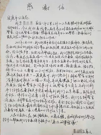 一封信,緊連著警民間的情誼;一頁信紙,書寫著群眾發自肺腑的感謝。“感謝貴局培養出的好警察,感謝他們愛民為民的情懷和積極擔當的作風……”近日,安康市公安局收到一封來自山東省滕州市濱湖鎮屈先生一家的手寫感謝信,字里行間滿是對安康市公安局漢濱分局西城派出所副所長胡龍及其同事許文波心系群眾、履職盡責、為民解憂的感激之情和贊許之意。