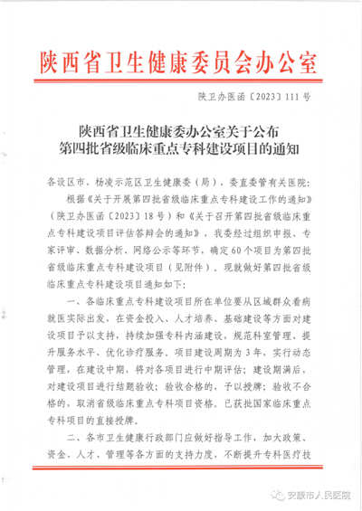 近日,陜西省衛(wèi)生健康委發(fā)文公布了第四批省級(jí)臨床重點(diǎn)專科建設(shè)項(xiàng)目名單,安康市人民醫(yī)院腫瘤內(nèi)科名列其中,順利被評(píng)定為省級(jí)臨床重點(diǎn)專科建設(shè)項(xiàng)目。