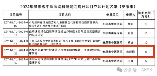 立項二:藥線點灸聯(lián)合絞股藍茶在黃素瘤應(yīng)用項目獲陜西省中管局市級中醫(yī)醫(yī)院科研能力提升項目(朱曉艷、袁銘悅)