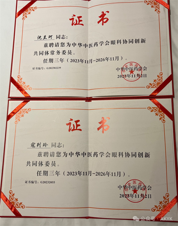 眼科醫(yī)院首席專家沈蘭珂教授被聘為中華中醫(yī)藥學(xué)會眼科協(xié)同創(chuàng)新共同體常委和陜西省中醫(yī)藥學(xué)會眼科專委會顧問、眼科醫(yī)院院院長寇列玲被聘中華中醫(yī)藥學(xué)會眼科協(xié)同創(chuàng)新共同體委員和陜西省中醫(yī)藥學(xué)會眼科專委會副主任委員、陜西省中西醫(yī)結(jié)合學(xué)會整形美容專委會副主任委員,并獲陜西省中西醫(yī)結(jié)合藥學(xué)會先進工作者;陜西省保健學(xué)會防盲專業(yè)委員會先進委員、陳利、王滿華、吉夢、張亞榮、周楊、張祥等10余人新增省中醫(yī)藥學(xué)會眼科專委會常委及委員任職。
