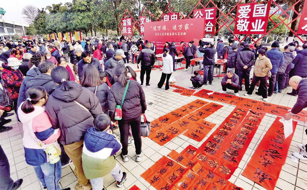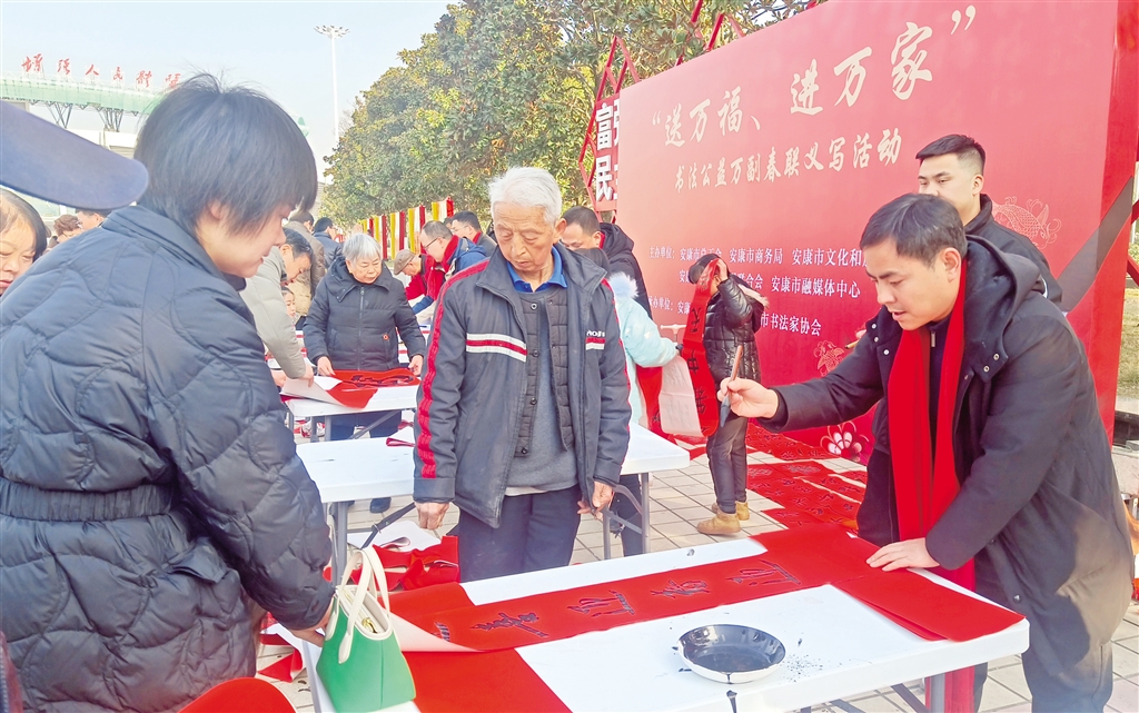 活動現場,人頭攢動,長桌一字擺開,書法家們精神飽滿,手中的毛筆飽蘸濃墨,筆鋒游走間,楷、行、隸、草等多種書體各顯神韻,一副副滿載祝福的春聯、一張張承載希望的“福”字躍然紙上,飽含著濃濃年味兒,寄托著人們對新年的美好憧憬與希望。前來領取春聯的市民絡繹不絕,大家一邊欣賞書法創作,一邊挑選著心儀的春聯內容,現場氣氛熱烈融洽。活動還將在安康高新區、西城坊、部分旅游景點等地持續進行。(記者 陸青波 攝)45Z安康新聞網