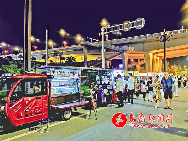 夕陽西下,夜幕降臨。四橋(東壩漢江大橋)下陸續被擺攤小販、貨車司機以及各色敞著后備箱的汽車所填滿。“泡面小姐姐”“荒野咖啡”“鮮花集市”……百米長的道……