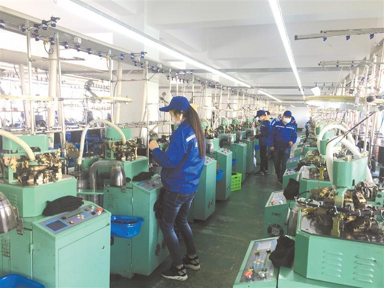 裝上棉紗、調好數據、按下開關,只見織襪機齒輪開始飛速運轉、針筒反復運動……不到3分鐘便有了襪子的雛形。次日一早,負責縫頭的農戶便會上門取走襪胚,進行下一……