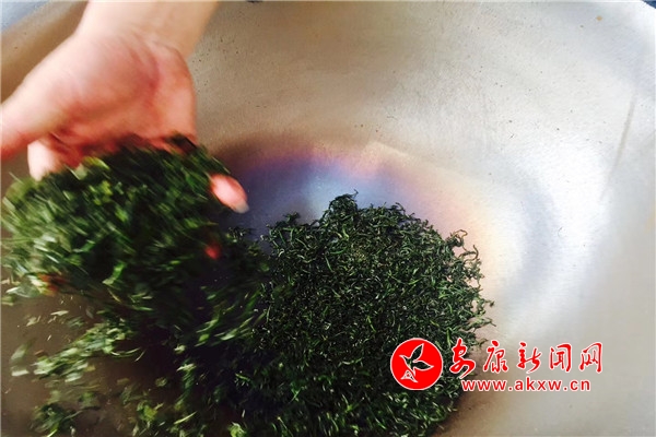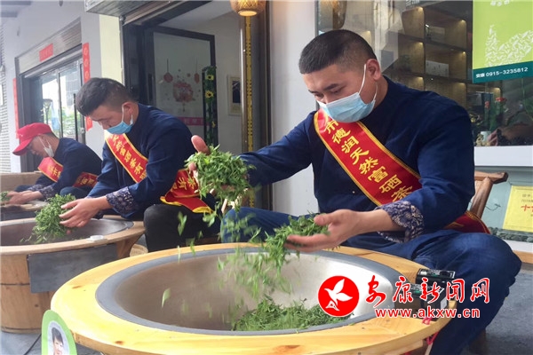 活動現場,三口電炒鍋一字排開,三位炒茶師傅雙手翻飛,嫩綠的鮮葉在他們手中滾動擠壓,揉捻、殺青、焙烘......最終成為我們常見的毛尖茶葉。hNi安康新聞網
