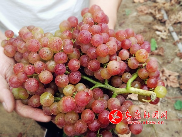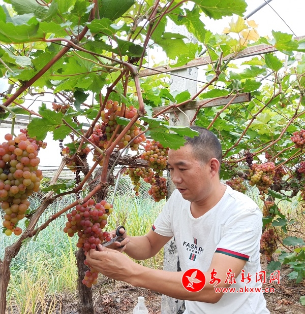 “5H葡萄是我們農場的主打品牌,皮薄無核,甜度高。”李華鋒在園里修剪著葡萄藤,并遞來兩串葡萄讓記者品嘗,記者隨手摘下幾顆品嘗,發現葡萄皮薄肉厚、香甜可口。