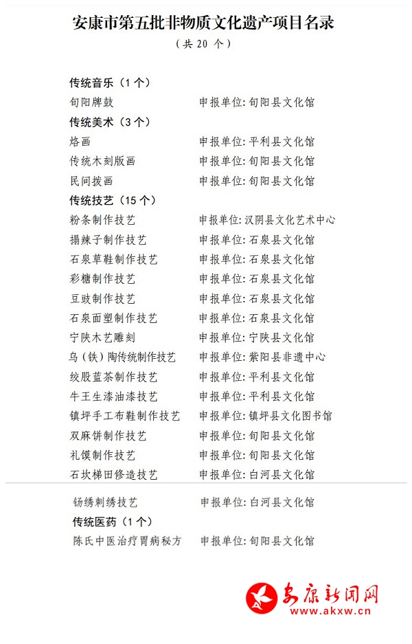 本網(wǎng)訊(實(shí)習(xí)記者 殷婷 楊一 )近日,安康市第五批非物質(zhì)文化遺產(chǎn)項(xiàng)目名錄公布。按照《中華人民共和國非物質(zhì)文化遺產(chǎn)法》和《陜西省非物質(zhì)文化遺產(chǎn)條例》相關(guān)規(guī)定,經(jīng)申報(bào)、評(píng)審、公示等程序,“旬陽牌鼓”等四大類20 個(gè)項(xiàng)目被列入該名錄,具體名單如下:Ftx安康新聞網(wǎng)