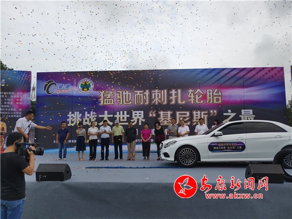 陜西猛馳汽車科技有限公司總經理徐曙光介紹,猛馳耐刺扎安全輪胎屬本公司研發的自主品牌,采用寬途3.0安全技術、納米高科技,目前是國內國際輪胎中技術最具先進且最具安全性能的品牌輪胎。“猛馳”耐刺扎安全輪胎具有不怕扎、防漏氣、防爆胎、自修復及降胎噪、高舒適和低油耗等多項高品質技術。本次挑戰活動他們將申報大世界基尼斯之最。