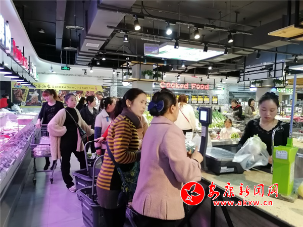 記者在城區(qū)內(nèi)各超市看到,實體店的購物狂歡,也很接地氣。促銷員叫賣各種特惠商品,大量民眾在挑選價格優(yōu)惠的生鮮、飲品、果蔬,超市收銀臺前也排起長隊。