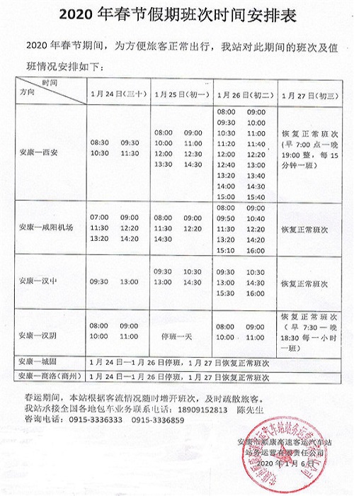 本網訊(實習記者 雷文鈺)2020年春節即將來臨,節假日期間的車輛班次成了大家關注的焦點,為方便旅客的正常出行,安康高速客運站特對春節期間安康到西安、咸陽機場、漢中、漢陰、城固以及商洛的班次做了調整,自2019年1月10日起,發車時間更改如下:YSh安康新聞網