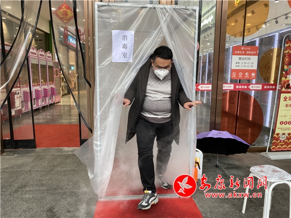 記者來到位于金州路的金坊國際購物廣場,該商場門口設置有一個顯眼的消毒室,前來購物的顧客須先測量體溫,然后進入消毒室消毒五秒以上,完成消殺過程,才能進去商場選購貨品。