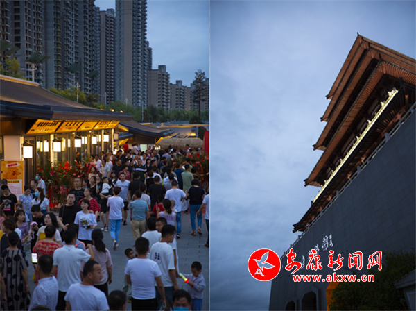 6月28日晚,夜色漸臨,漢江邊上,西城閣旁,古西城文化園(西城坊)游人如織。人們?nèi)宄扇海虺藳鲇瓮妫蚓鄄蜁痴劊慌煞比A熱鬧景象。(記者 張世虎 攝) Bw3安康新聞網(wǎng)