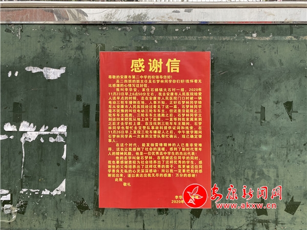石夢林見義勇為的事跡,直到傷者李先生的感謝信送到學校,才被大家所知曉。但他覺得這并不是什么大事。“早晨行人比較少,肇事者又逃逸,所以我必須幫助這個老人,否則他的傷勢可能會更加嚴重。”石夢林說,“平時在學校開班會、年級大會時老師都會教導我們要助人為樂、與人為善,我只是做了我力所能及的事情。”