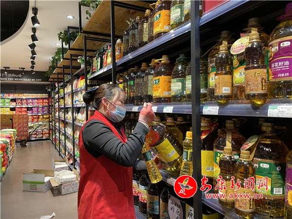 隨后,記者又來到了喜盈門超市中心店,工作人員會給每個進(jìn)入人員進(jìn)行體溫測量。超市內(nèi),工作人員也在持續(xù)給貨架補(bǔ)貨,貨架上物資很充足。