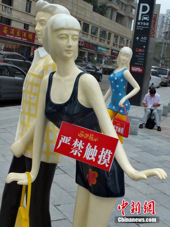 2014年8月6日,湖北宜昌市桔城路福久源商業街廣場上塑起4個嶄新的時尚模特塑像,其中3個“胸器”誘人的性感女模特塑像身上掛出了“嚴禁觸摸”提示牌。 圖片來源:東方ICyGQ安康新聞網