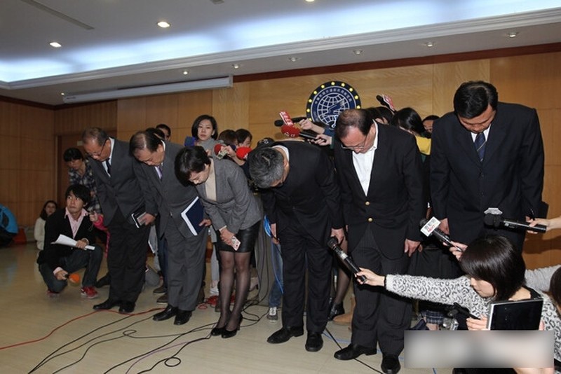 復興航空執行長陳欣德2月4日下午率復航高層召開記者會,會前所有干部鞠躬道歉。陳欣德說,深深感到抱歉,致上十二萬分歉意。圖為現場。
