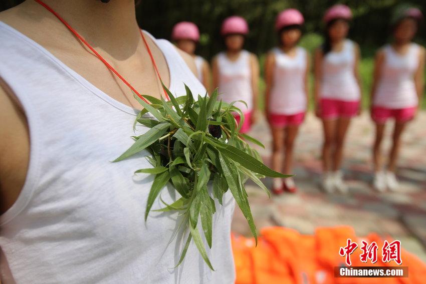 4月29日,河南省三門峽市女子漂流救援隊員佩戴偽裝成花草的視頻記錄儀,對漂流河道進行安全檢查。該視頻記錄儀可放置在頭頂對全身進行監控、也可以放置在胸部、下身等處對局部進行監控。據了解,這種裝備是為了防止少數故意落水的男游客,對女救援隊員動手動腳的不文明行為。圖片來源:CFP視覺中國3Up安康新聞網