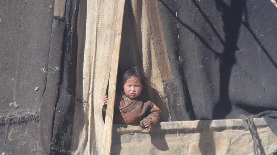 留守帳篷的孩子見到家里之外的人很好奇