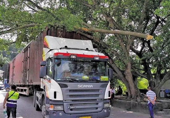 9月13日上午11時左右,在廣州花都區花東鎮竹湖村,一輛外地來的貨柜車刮斷了村口一棵數十年樹齡的榕樹的一條樹枝(見上圖),村民將貨車扣留下來,要求貨柜車司機盛先生賠償18.8萬元。19日,羊城晚報記者了解到,最終盛先生在當地派出所的協調下,與竹湖村村民代表協商達成一致,賠付2.8萬元,15日晚盛先生已經取走貨柜車。
