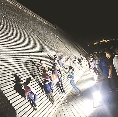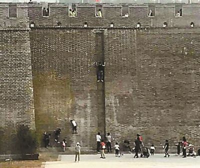 北京青年報記者在網友提供的照片中看到,正定古城墻外壁的墻磚間形成了一級級兩三厘米寬的小臺階,十幾個孩童側著身子、徒手攀爬至兩三米高處,家長們站在城墻下給孩子拍照,而一旁“禁止攀爬”的警示牌則被無視。更有成年攀爬者在沒有保護措施的情況下,徒手攀爬至六七米高。眾多游客攀爬城墻,遠看好似攻城,甚至讓部分游客誤以為這是該旅游景點的游樂項目。