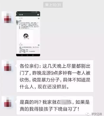 【傳聞】有網傳消息稱,“各位親們,這幾天晚上盡量別出門了,昨晚9點多遼陽龍源有一老人被砍傷,說是暴力分子,具體不知道是什么人,現在還沒抓到”。
