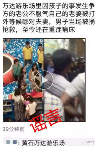 【傳聞】湖北黃石、湖南湘潭、益陽以及山東煙臺等地傳出“在萬達廣場一樓游樂場,兩位母親因為娃娃的事發生爭吵,隨后,一女子老公因不服氣自己的老婆被打,叫人在萬達外等候里面那對夫妻,男子當場被捅死,女的還在搶救,至今還在重癥病床”。