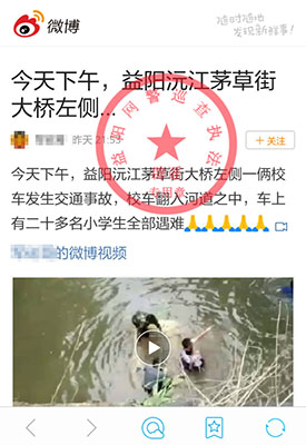 【傳聞】9月7日,一名為“軍砣哥”的網民在微博發帖稱,“今天下午,益陽茅草街左側一輛校車發生交通事故,校車翻入河道之中,車上有二十多名小學生全部遇難”,并附上現場車輛墜河視頻,該消息很快被部分網民轉發。