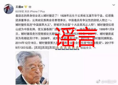 【傳聞】中國金融博物館理事長王巍發布微博稱,知名企業家褚時健去世,該消息一出,引發網民大量轉發。