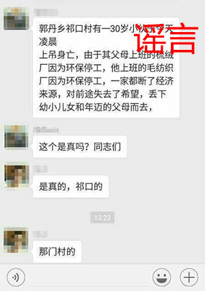 【傳聞】網傳“河北保定蠡縣郭丹鄉祁口村有一30歲小伙子今天凌晨上吊身亡。其父母上班的梳絨廠因為環保停工,他上班的毛紡織廠也因為環保停工,因為家里都斷了經濟來源,遂對前途失去了希望,丟下年幼的兒女和年邁的父母而去”。