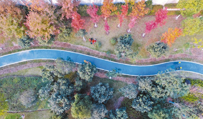 圖為11月27日空中俯瞰新建的“慢行綠道”。為給市民出行營造良好的環境,國家園林城市——浙江省慈溪市今年9月底在北三環路兩側開辟出兩條3公里長的“慢行綠道”。該綠道采用生態透水混凝土,并配以座椅、垃圾桶、照明等設施,綠蔭環繞滿布花草。近兩年來,浙江省慈溪市積極倡導市民綠色低碳出行,目前該市共建成“慢行綠道”22公里。iNG安康新聞網