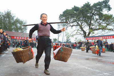 近日,四川省華鎣市明月鎮劉家廟村舉行以“美麗新農村,健康新農民”為主題的農民運動會。通過精準扶貧逐漸走上致富之路、過上幸福生活的村民參加了挑擔子、包抄手、套圈等趣味競技項目,以這種特別的方式慶祝豐收。圖為劉家廟村村民在參加挑擔子比賽。8Wf安康新聞網