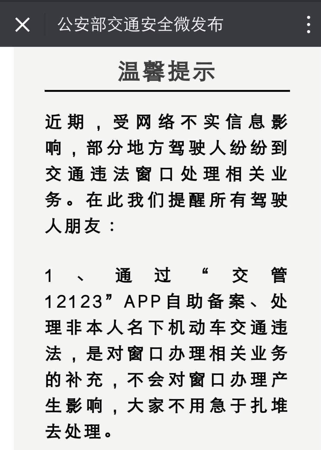2月26日,公安部交通管理局通過官方微信發布文章,對新增項目推出后群眾提出的問題進行答疑,并提醒駕駛人朋友稱“通過‘交管12123’APP自助備案、處理非本人名下機動車交通違法,是對窗口辦理相關業務的補充,不會對窗口辦理產生影響,大家不用急于扎堆去處理。”同日,北京交警也通過官方微信辟謠稱“3月1日起,不綁定備案就不能處理非本人名下車輛違法”系誤讀,并提示:在北京市,不通過網上渠道處理非本人名下機動車交通違法的車主,依然可以通過各交通支、大隊執法站窗口辦理。