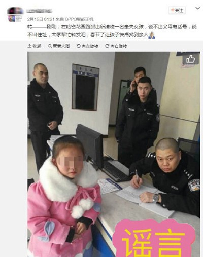 與此類似的謠言還有“在某某路派出所接收一名走失女孩,說不出父母電話號,說不出住址,大家幫忙轉發吧,春節了讓孩子快點找到親人”。經警方核實,該事發生在四川省自貢市,女孩已于2月13日被其父母接回。該謠言在全國多個省市傳播,各地網警紛紛辟謠,請大家不要繼續傳播!