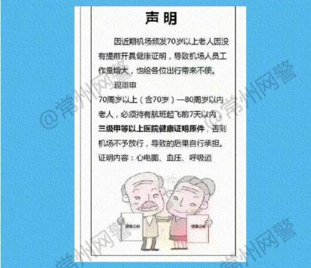 2月11日,常州網警辟謠稱,此消息不準確。根據《中國民用航空旅客、行李國內運輸規則》,對于老年人乘坐飛機,并沒有年齡上的特殊限制。實際上,各航空公司的規定并不一樣。