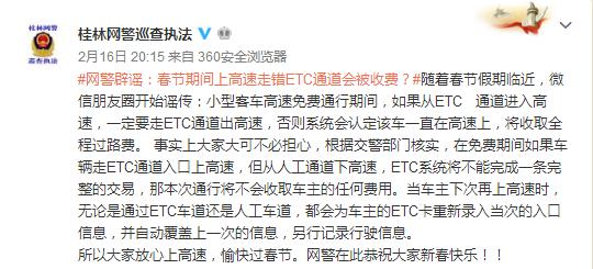 春節假期,微信朋友圈謠傳:小型客車高速免費通行期間,如果從ETC通道進入高速,一定要走ETC通道出高速,否則系統會認定該車一直在高速上,將收取全程過路費。
