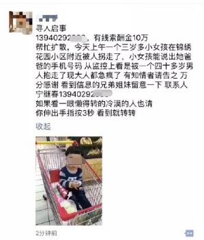 近日,多地網民轉發圖片稱“今天上午寧繼春的三歲女兒在錦繡花園小區附近被人拐走了,女兒能說出她爸爸的手機號碼……從監控上看,小女孩是被一個四十多歲男人抱走了,現大人都急瘋了,有知情者請告之。萬分感謝……”