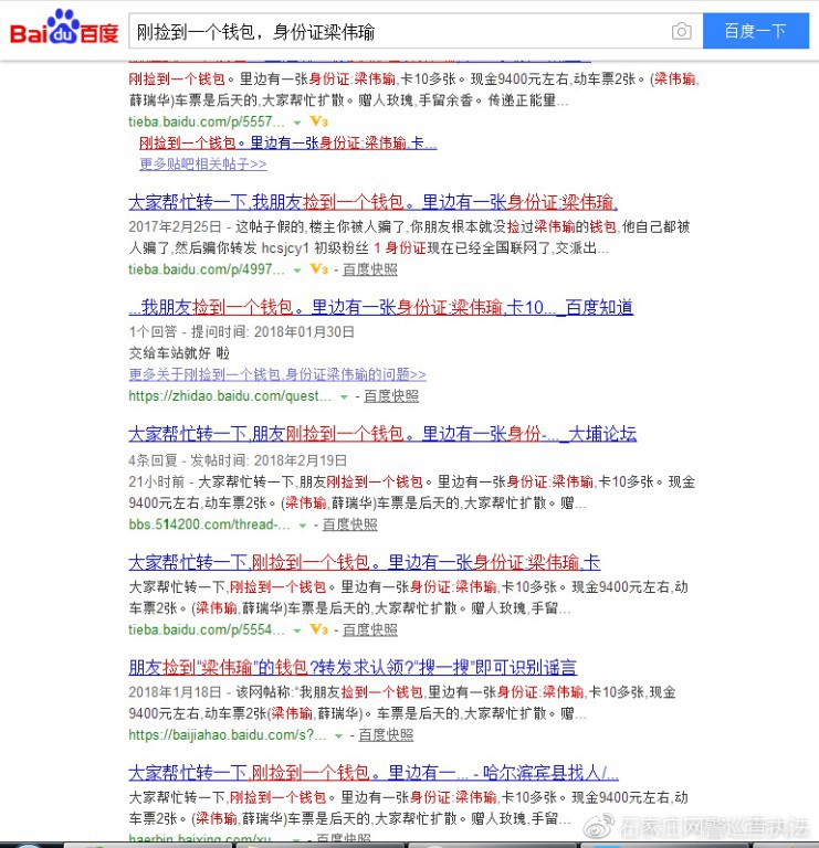 但是,經警方調查,網傳消息中的聯系電話一直無法接通。該手機號碼的歸屬地顯示為廣東深圳,并被多個用戶標記為騷擾電話。通過搜索發現,這條“失物招領”在網絡上已經流傳很久。除了失主的姓名“梁偉瑜”“薛瑞華”沒變之外,聯系人的電話號碼卻出現過多個版本,類似的“失物招領”虛假信息也有很多。網絡中流傳“徐俊峰”“劉馨心”等多人丟失錢包的網帖,同樣都被證明為謠言。可見,所謂的“失物招領”實際上是一條“陳年老謠”,只要把其中的姓名、聯系方式等信息進行替換,這條謠言便又能改頭換面,重新在網絡中流傳。