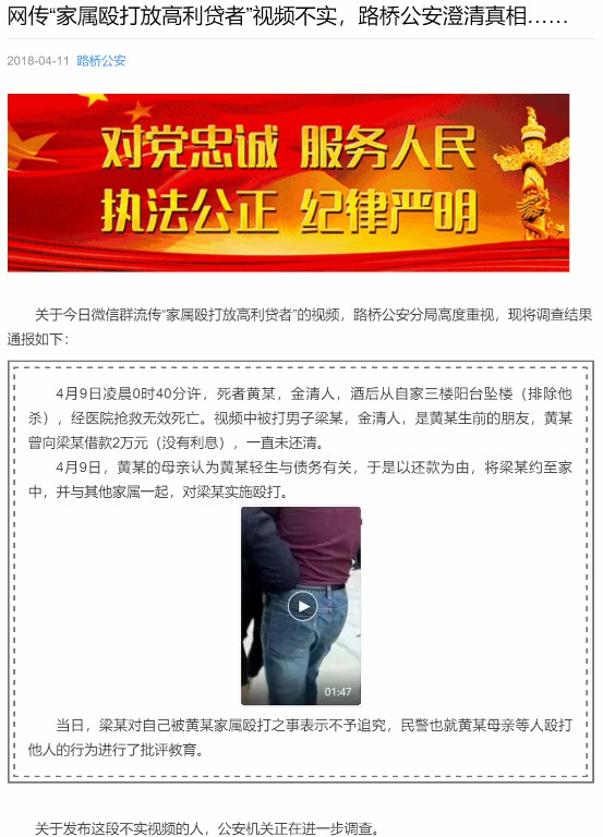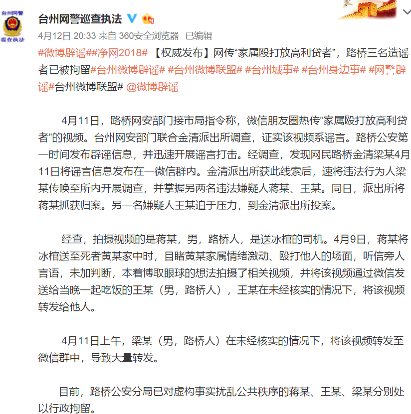 人民網北京4月13日電 (孝金波 楊思萱)近日,一則浙江臺州“家屬毆打放高利貸者”的視頻在微信群中流傳,臺州路橋區警方迅速調查情況,澄清辟謠。4月12日,路橋公安分局對三名涉謠者處以行政拘留。