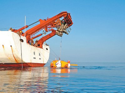 圖為24日科考隊員在布放“潛龍三號”,從母船將其放入水中。(記者 劉詩平 攝)