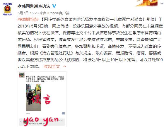 網傳的10秒長的小視頻顯示,在一個游樂場中,一名年輕女子坐在地上不斷哭喊,在其旁邊的游樂設施上,一名男子抱著一個孩子,地上滿是鮮血。視頻所配文字稱:“這是某地今天發生的,以后不要帶孩子坐這個玩具了!”其中,“某地”被傳為河北石家莊、云南大理、陜西漢中、湖北孝感等多地的游樂場,引發網民關注熱議。