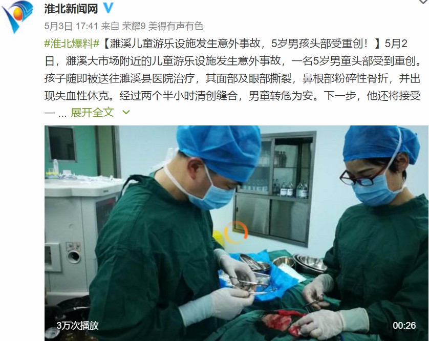 對此,石家莊、孝感等地網警紛紛辟謠。據“淮北新聞網”報道,2018年5月2日,安徽省濉溪縣大市場附近的兒童游樂設施發生意外事故,一名5歲男童頭部受到重創。孩子隨即被送往濉溪縣醫院治療,其面部及眼部撕裂,鼻根部粉碎性骨折,并出現失血性休克。經過兩個半小時清創縫合,男童轉危為安,后續還要繼續進行治療。