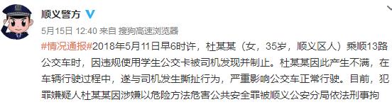 5月15日午間,北京市順義區(qū)警方發(fā)布了情況通報(bào)。5月11日早6時(shí)許,35歲的順義區(qū)女子杜某某在乘順13路公交車時(shí),因違規(guī)使用學(xué)生公交卡被司機(jī)發(fā)現(xiàn)并制止。杜某某因此產(chǎn)生不滿,在車輛行駛過程中,遂與司機(jī)發(fā)生撕扯行為,嚴(yán)重影響公交車正常行駛。目前,犯罪嫌疑人杜某某因涉嫌以危險(xiǎn)方法危害公共安全罪被順義公安分局依法刑事拘留。