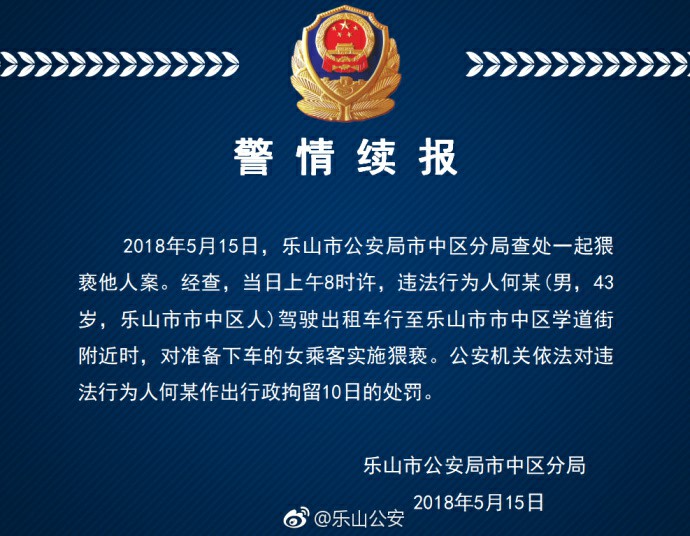 5月15日18時,四川樂山警方發布警情續報,2018年5月15日,樂山市公安局市中區分局查處一起猥褻他人案。經查,當日上午8時許,違法行為人樂山市市中區何某,其駕駛出租車行至樂山市市中區學道街附近時,對準備下車的女乘客實施猥褻。公安機關依法對違法行為人何某作出行政拘留10日的處罰。