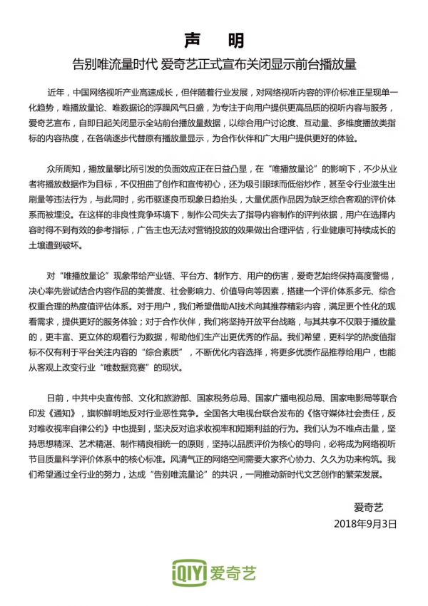 對此,愛奇藝回復稱,“我們也將持續觀察市場最新狀態,如果市場前臺流量數據能夠凈化到基本真實、公平反映內容價值的程度,不排除恢復前臺流量顯示。”