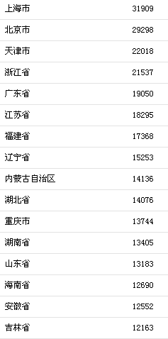 國家統計局公布的31省份居民人均可支配收入顯示,上海、北京、浙江前三季度居民人均可支配收入排名前三。