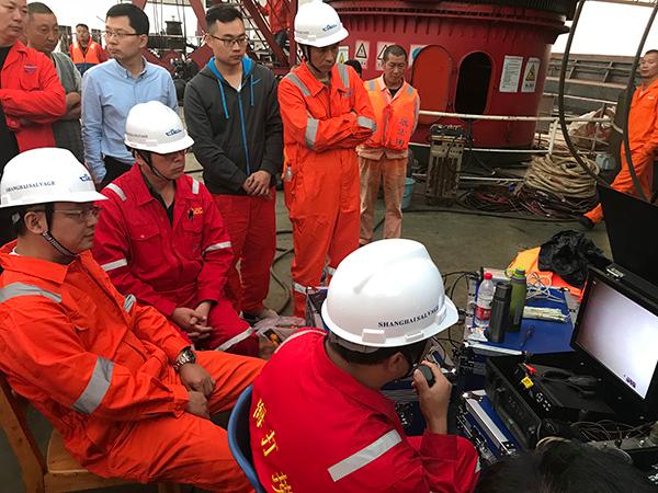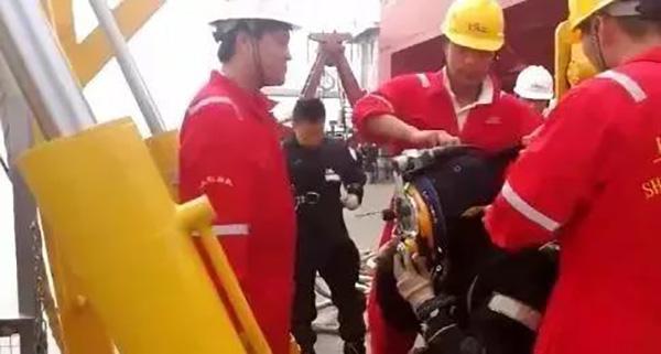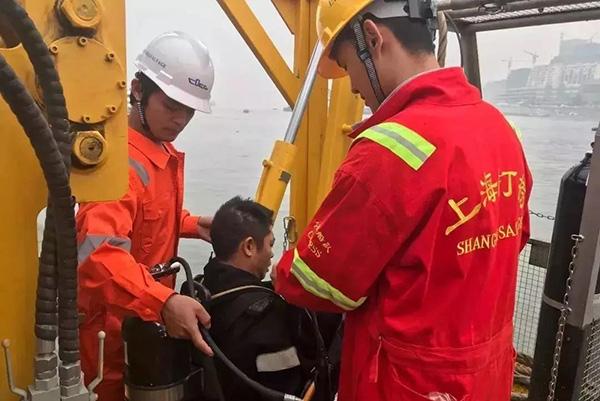 6時50分,設備調試完成后,交通運輸部上海打撈局兩名專業潛水員第一次下水摸探。