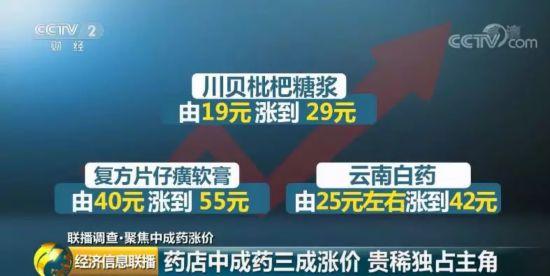 廣東省惠州市的一家藥店的負(fù)責(zé)人告訴記者,從年初開始,已經(jīng)有近三成的中成藥陸續(xù)漲價(jià),川貝枇杷糖漿由原來的19元漲到了現(xiàn)在的29元,復(fù)方片仔癀軟膏由40元漲到55元,云南白藥現(xiàn)在的價(jià)格也已經(jīng)提到每盒42元,而去年的零售價(jià)還約在25元左右。